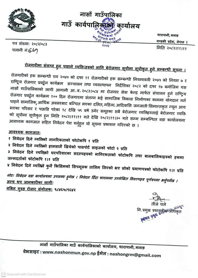 रोजगारीमा संलग्न हुन चाहिने व्यक्तिहरुको लागि वेरोजगार सूचीमा सूचीकृत हुने सम्वन्धी सूचना
